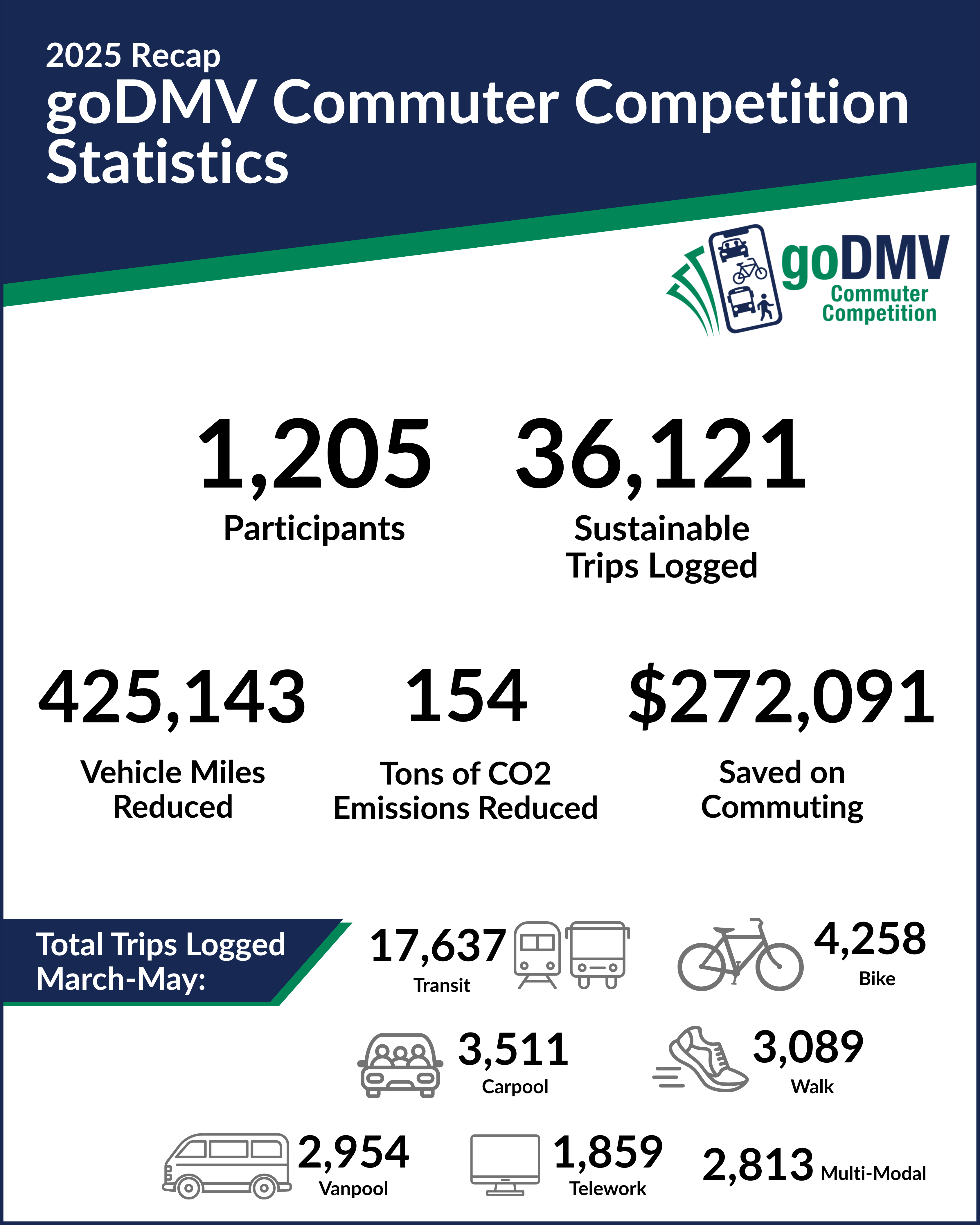 Commuters will be able to join the goDMV Commuter Competition as individuals and as part of an employer team when registration opens in February 2026. Check back often as we update this page with more details on prizes and ways you can win. In the meantime, make sure you’re ready to participate!